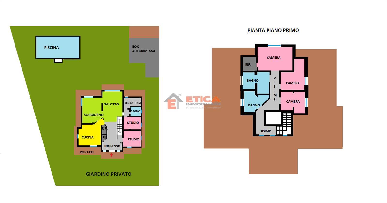 Al piano terra l’ampio atrio introduce in un luminoso salone con zona pranzo separata, perfetto per accogliere famiglia e ospiti. La cucina abitabile, grande e conviviale, è l’ambiente ideale per chi ama vivere la casa con calore. Completano il piano uno studio, un bagno di servizio, locali accessori e ripostigli.