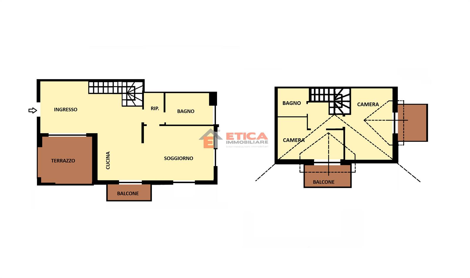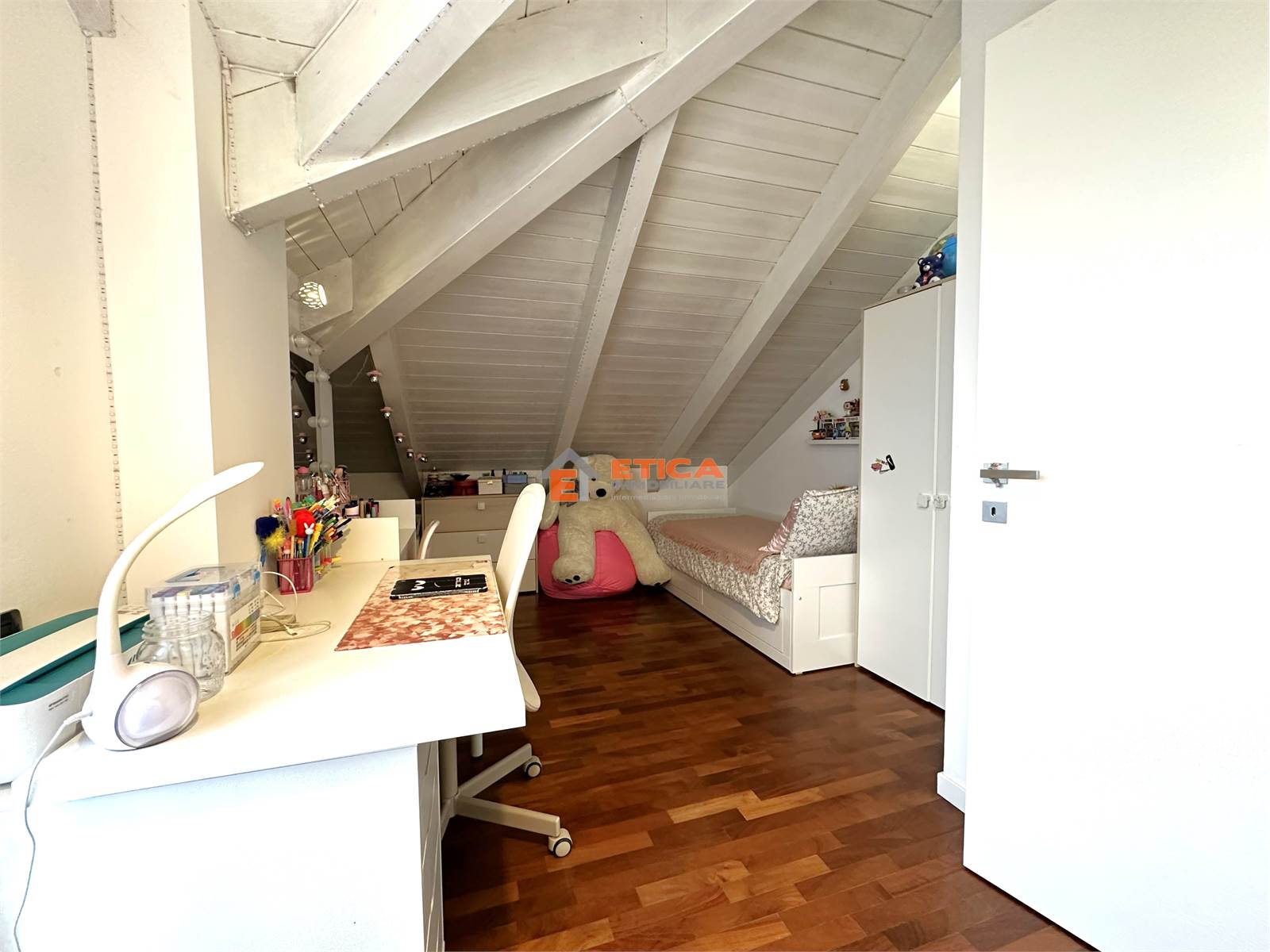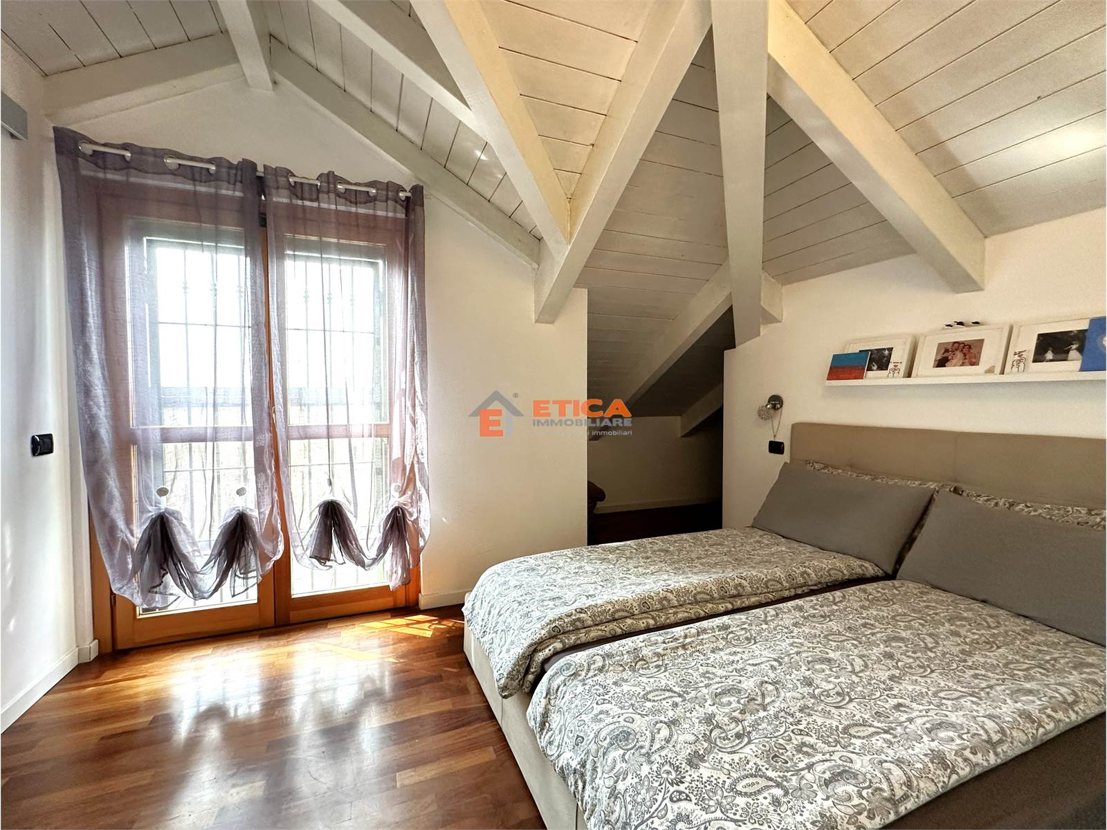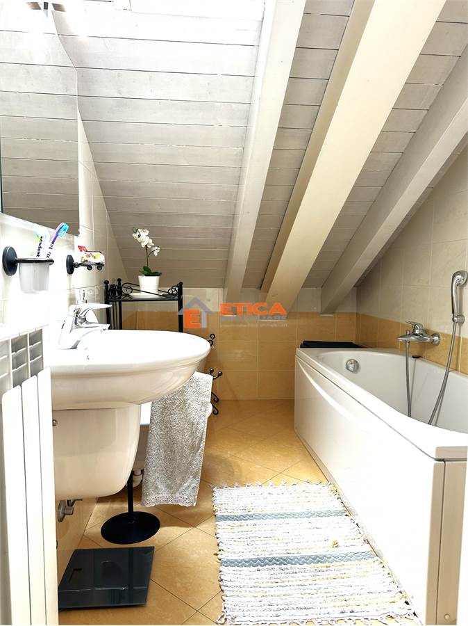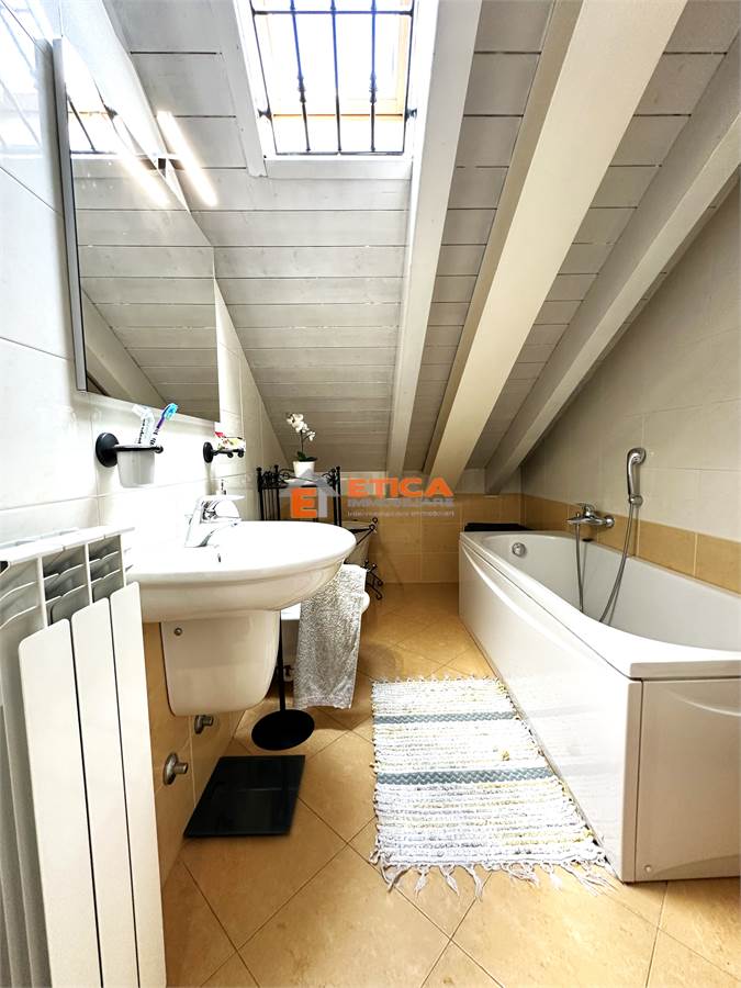 ingresso direttamente nella zona living composta da zona sofà con accesso al terrazzino loggiato, cucina con sala da pranzo avente accesso ad un secondo balcone, bagno; al piano superiore, collegato da scala interna, sono presenti due camere con soffitti in legno travi a vista, entrambe dotate di balcone ed un secondo bagno.