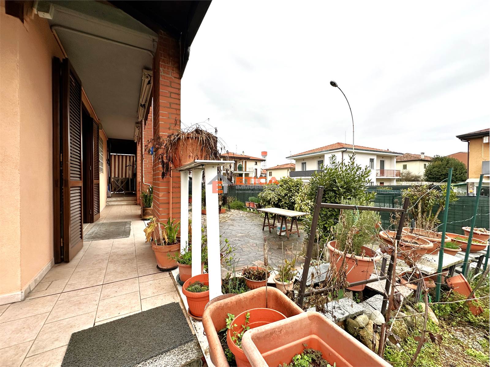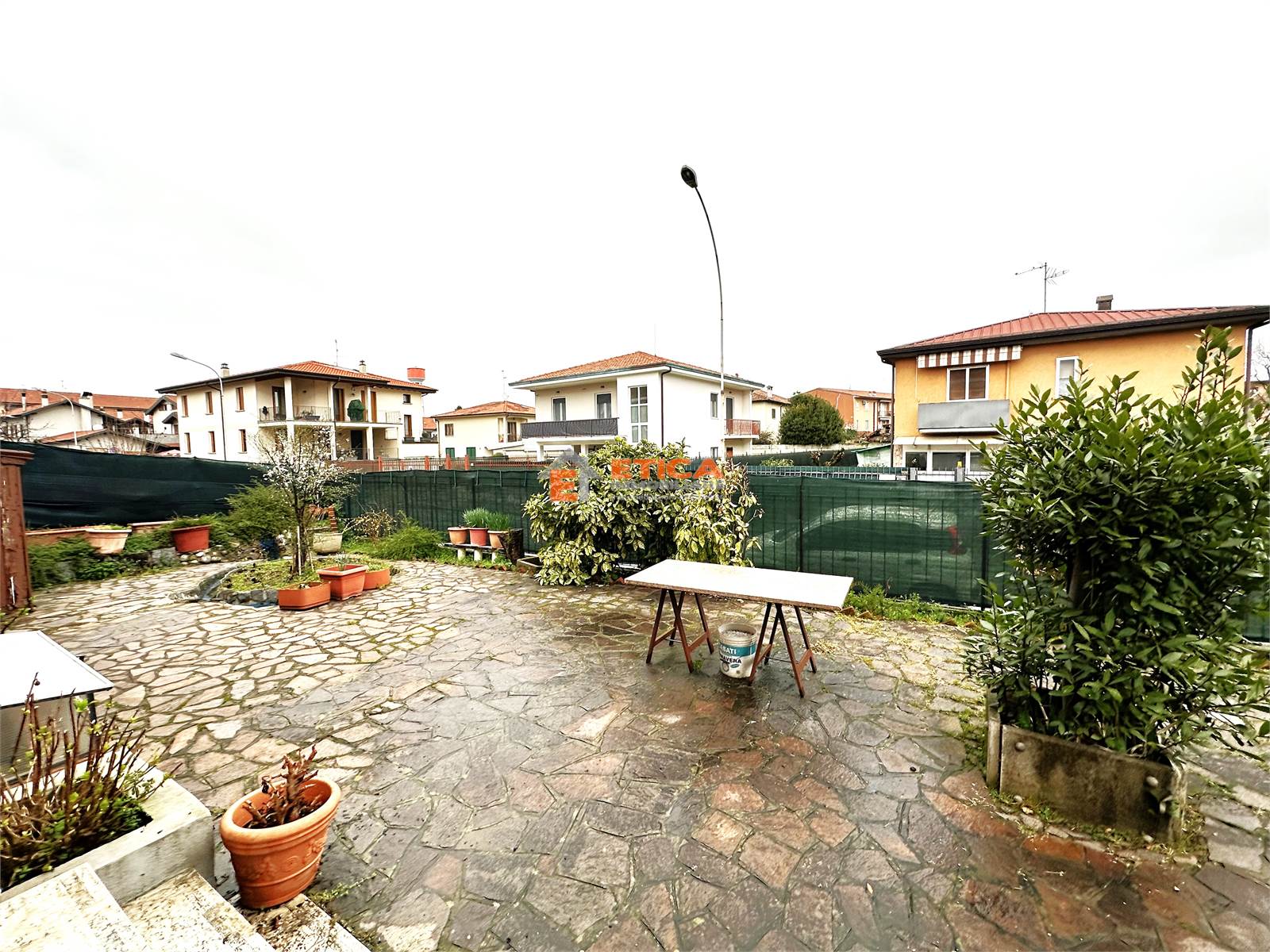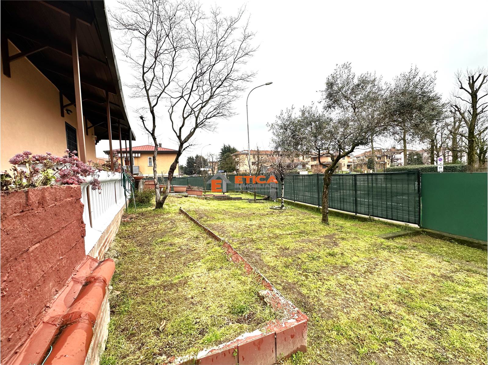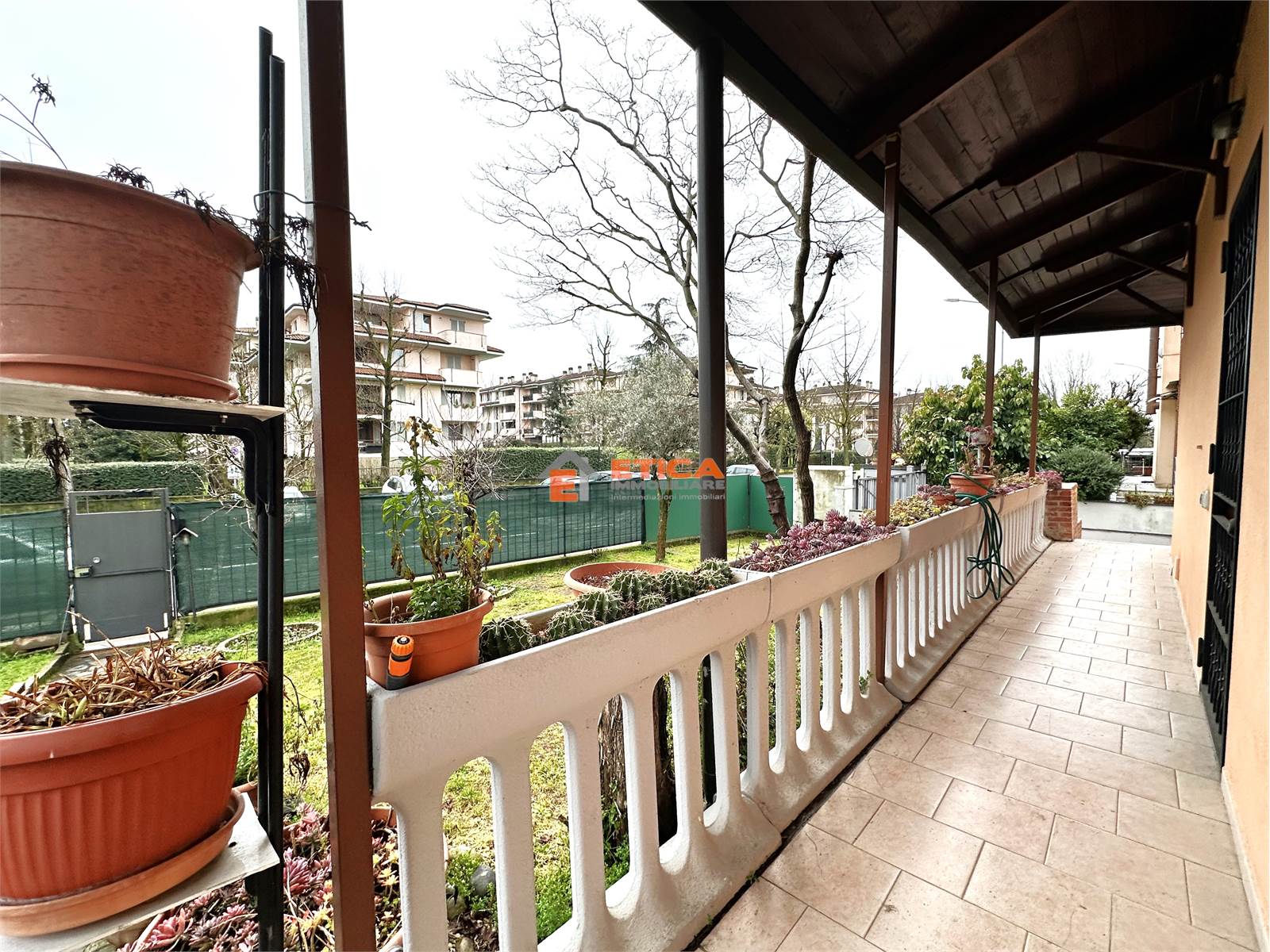 La villa è circondata da un giardino angolare, in parte lastricato, che garantisce privacy e tranquillità, mentre un ampio terrazzo coperto, accessibile dalla cucina, è l'ideale per pranzi e cene all'aperto.