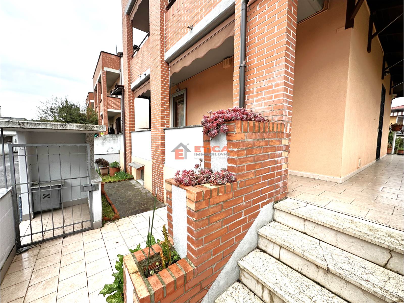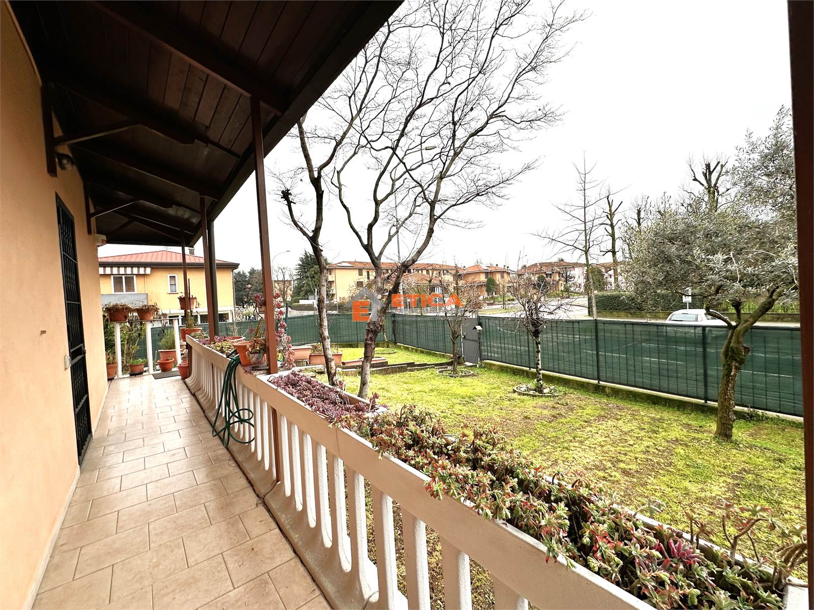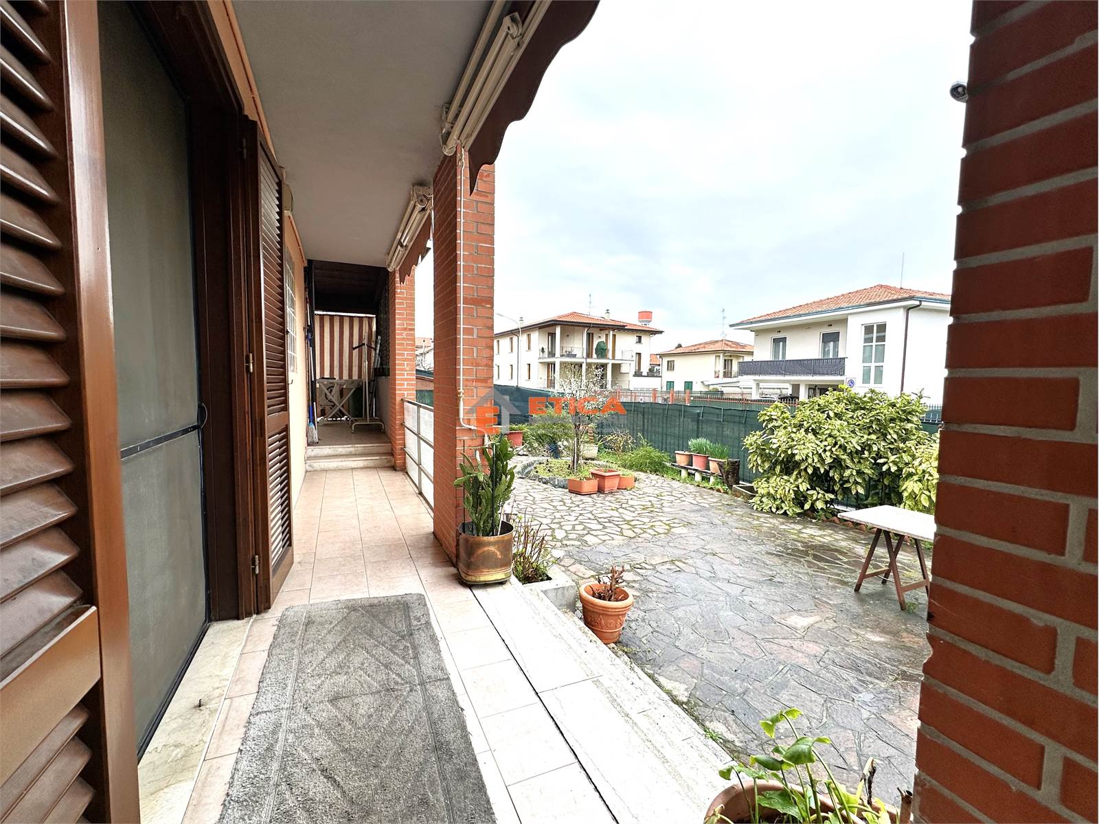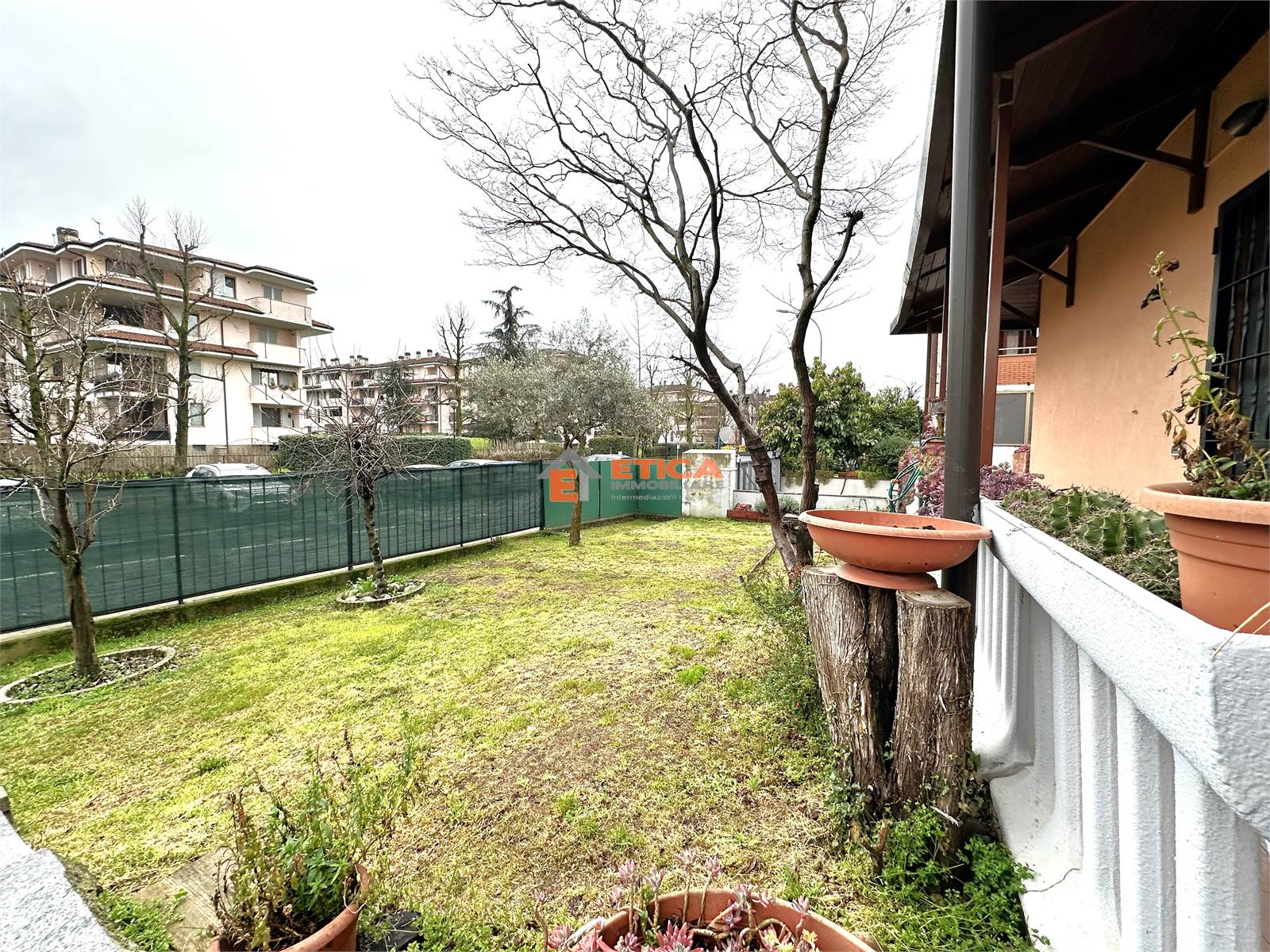 La villa è circondata da un giardino angolare, in parte lastricato, che garantisce privacy e tranquillità, mentre un ampio terrazzo coperto, accessibile dalla cucina, è l'ideale per pranzi e cene all'aperto.