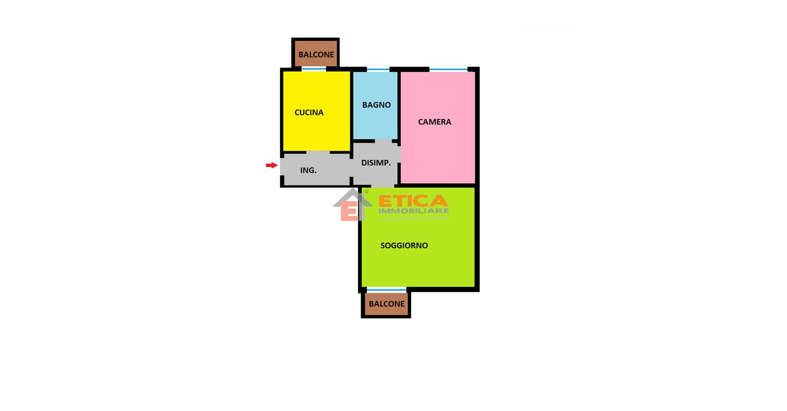 ingresso, cucina abitabile con accesso al balcone, disimpegno, bagno padronale, camera matrimoniale e ampio soggiorno con balcone.