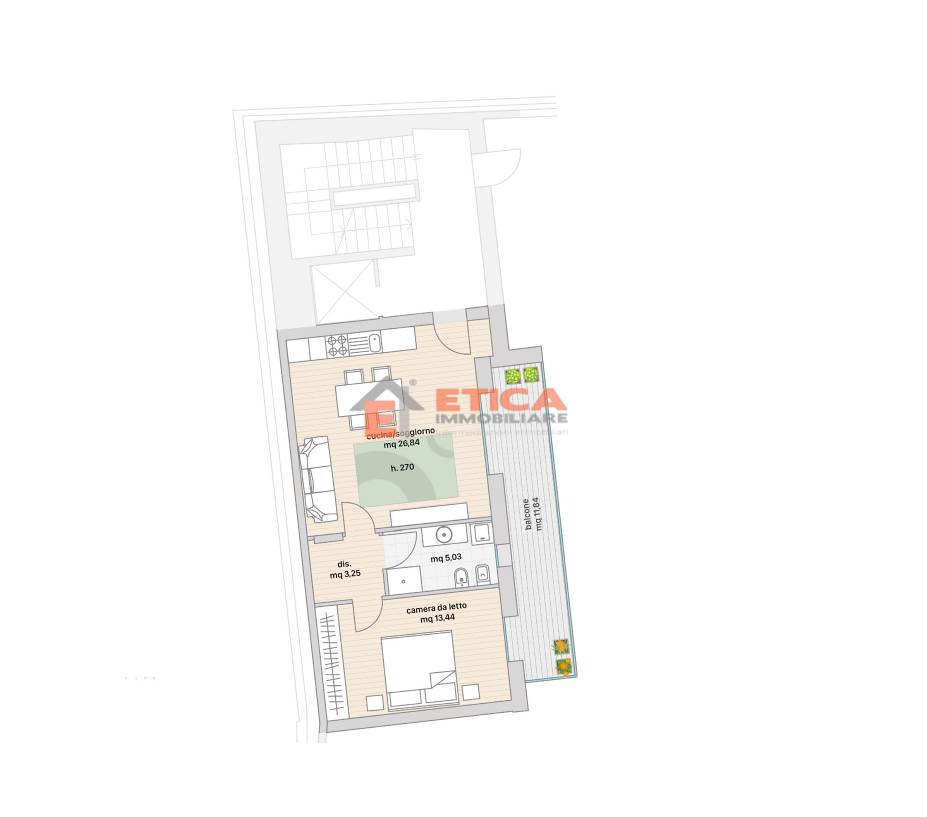 L'appartamento è composto da un ampia zona living di circa 27 mq calpestabili con un balcone di circa 12 mq, disimpegno, camera, bagno. Possibilità acquisto box.