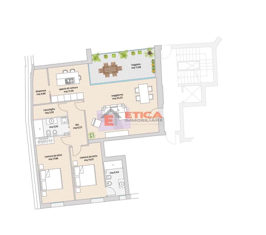 L'appartamento è composto da soggiorno con terrazzino loggiato di 12 mq, cucina con dispensa, ripostiglio, due camere matrimoniali, due bagni. Possibilità acquisto box.